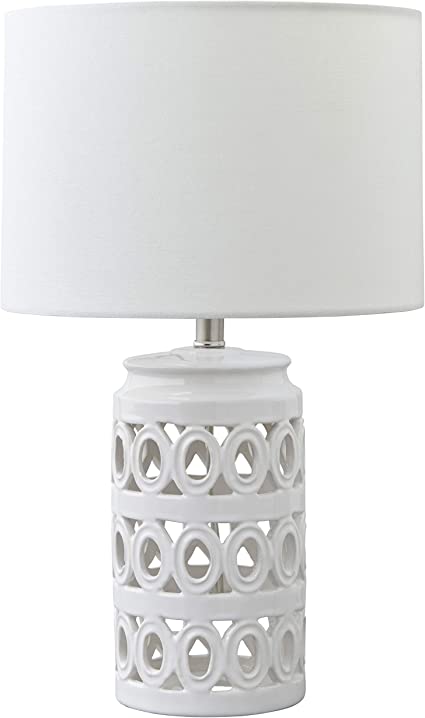 This ceramic lamp’s cylindrical base features a pretty design with alternating lines and circles. The spherical cloth shade is supported by the brushed-nickel frame, giving this lamp a sleek, contemporary appearance.